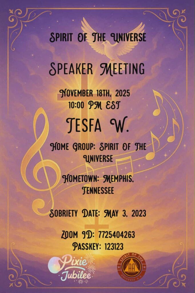 2025/11/18 – Tesfa W.By brianl / November 22, 2025 11/18/25 @ 10:00 PM ESTTesfa W.Home Group: Spirit of the UniverseHometown: Memphis, TNSobriety Date: May 3, 2023