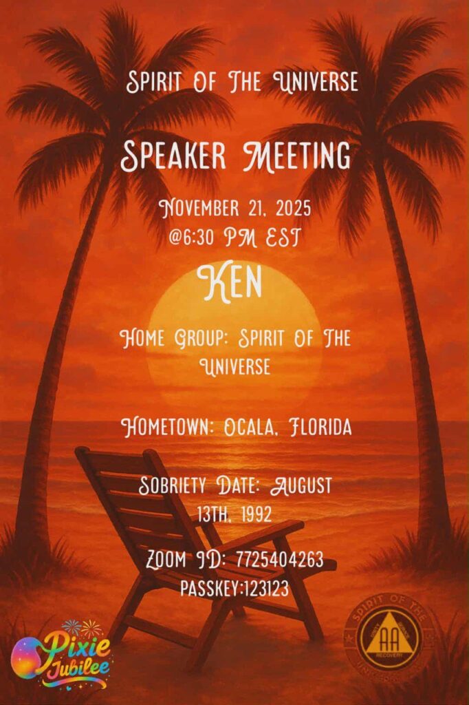 2025/11/21 – Ken G.By brianl / November 22, 2025 11/21/25 @ 6:30 PM ESTKen G.Home Group: Spirit of the UniverseFrom: Ocala, FLSobriety Date: August 13, 1992