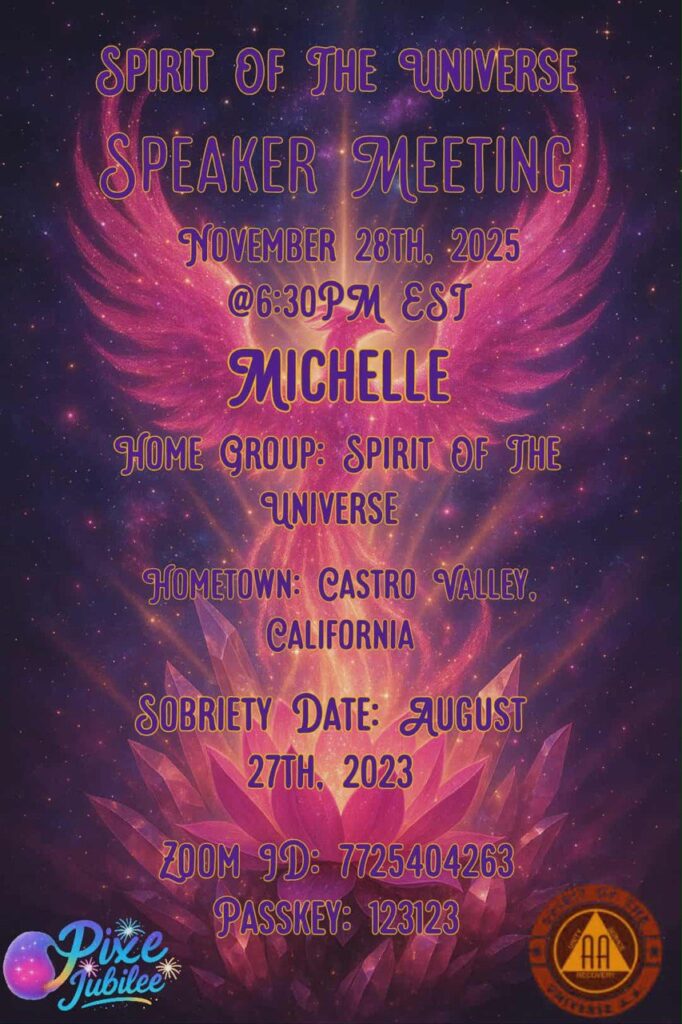 2025/11/28 – MichelleBy brianl / December 8, 2025 MichelleCastro Valley, CaliforniaHome Group: Spirit of the UniverseSobriety Date: August 27th, 2023