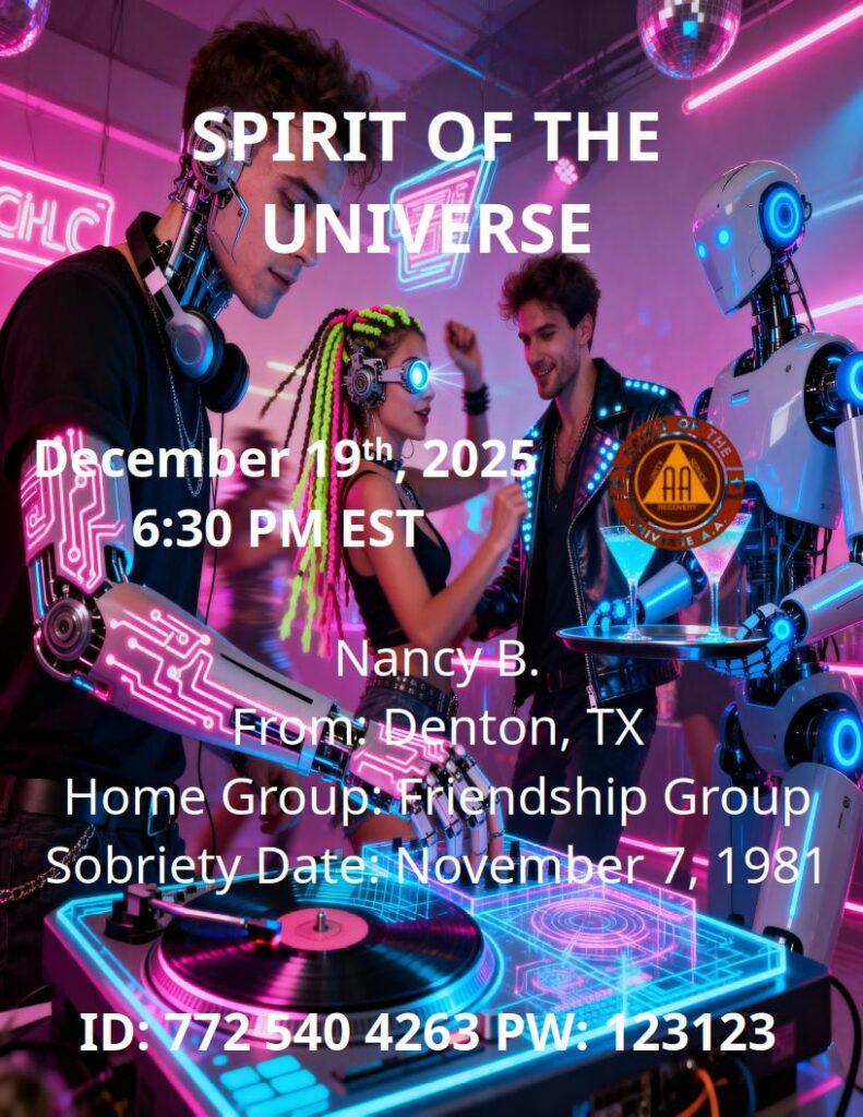 2025/12/19 – Nancy BBy brianl / January 10, 2026 12/19/25 @ 6:30 PM ESTNancy B.Denton, TXFriendship GroupSobriety Date : November 7, 1981