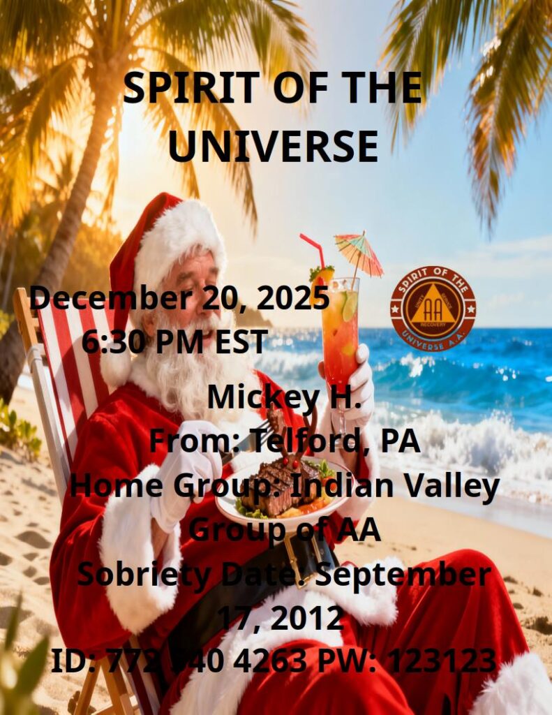 2025/12/20 – Mickey HBy brianl / January 10, 2026 12/20/25 @ 6:30 PM ESTMickey H.From: Telford, PAHomegroup: Indian Valley Group of AASobriety Date: September 17, 2012